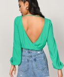 All eyes on you in the Eyes For You Open Back Top in Green. This backless long sleeve top features a boat neckline, cropped construction, cinched sleeves and hem, support strap, and a gorgeous open surplice back. Show off the next time you go bar hoppin’, and pair this evening crop top with high waisted jeans.