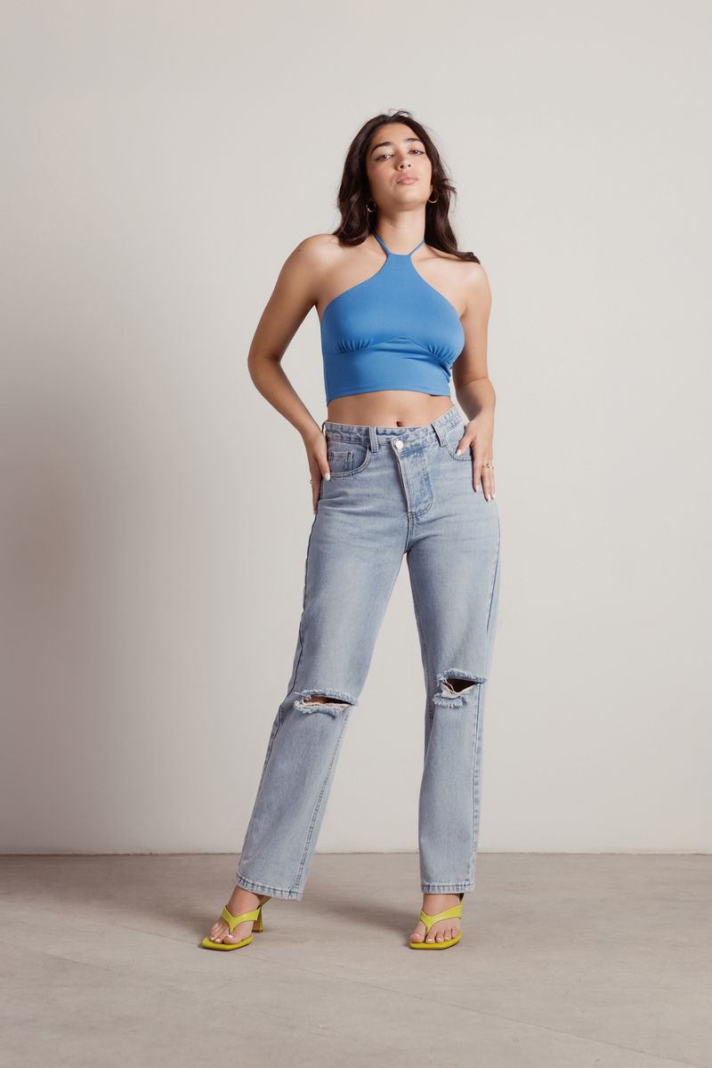Get your way in the Get Your Way Crop Top in Blue! This perfect summer piece features an adjustable tie halter and flirty backless details, making it ideal for sunny days. Pair it with strappy kitten heels and white wide-leg pants for a cute vacation-ready look that’s both chic and effortless. Ready to turn heads wherever you go!