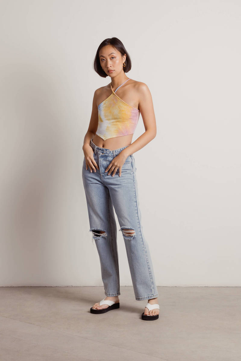 Feel the groove in the Look Over Here Tie-Dye Diamond Crop Top in Rainbow! This eye-catching crop top features a bold tie-dye print and a playful handkerchief hem, giving you that perfect mix of relaxed and stylish. Pair it with high-waisted denim jeans and sandals for an effortlessly cool look, perfect for running errands or hanging out with friends. Stay comfy, stay chic!